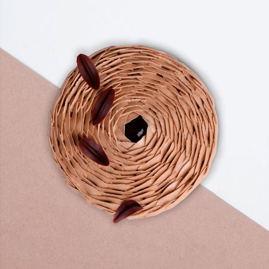 • Photo of a chocolate bar packaging sized by side with the unpacked chocolate bar.  You can see the beautifully designed packaging and textured pattern on the chocolate bar.