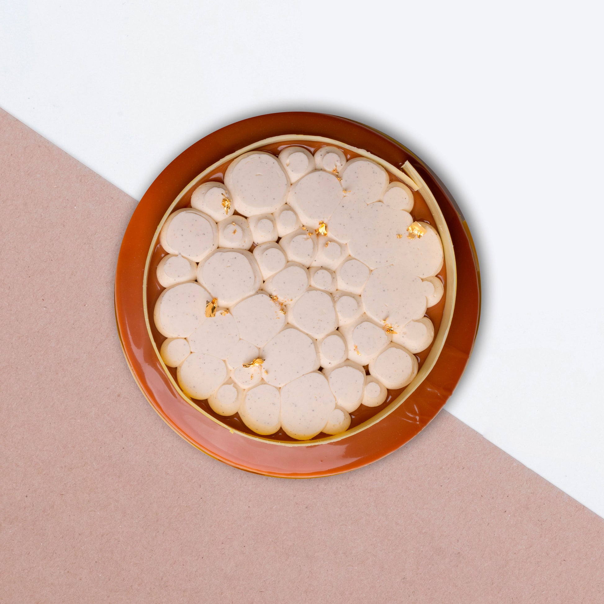 Creamy passion fruit curd, fresh lemon mousse, vanilla whipped ganache, caramel & sablé biscuit.